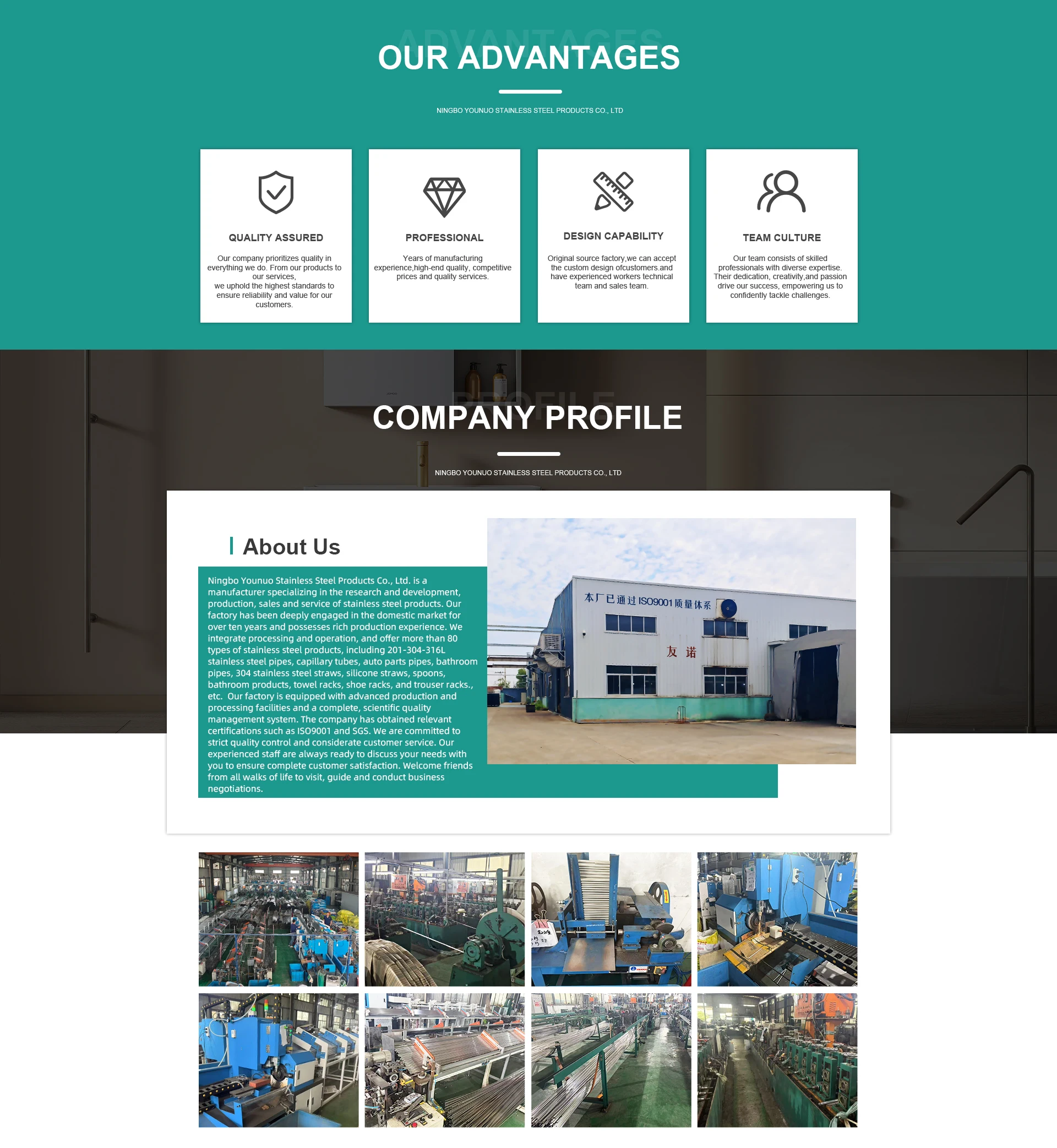 Ningbo Younuo Stainless Steel Products Co., Ltd. Productos principales:Tubería de acero inoxidable, bobina de acero inoxidable, productos de baño de acero inoxidable, pantalones y colgador de acero inoxidable, lámpara solar de acero inoxidable insertada en el suelo